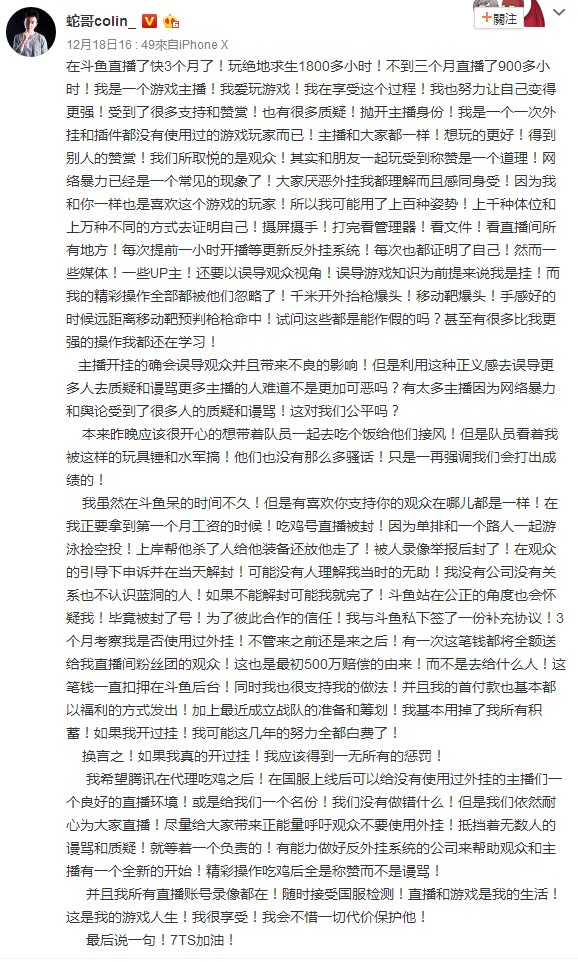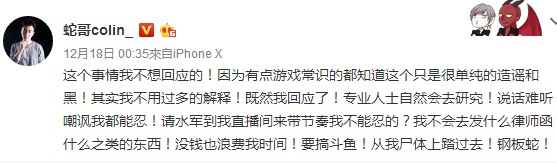 对此,@蛇哥colin_在微博对被曝开挂一事进行了辟谣,表示有点常识的人都知道这是单纯的造谣,自己一次外挂和插件都没有使用过,有人以误导观众视角,误导游戏知识为前提来说他是挂。
