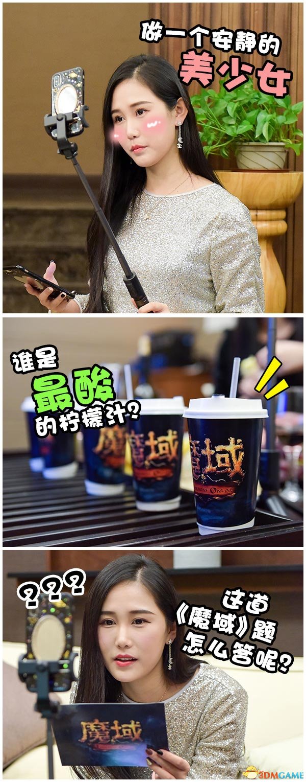 而这玩家也绝对是《魔域》的真爱粉,不管是客厅还是书房布置,都能看到《魔域》专属手办、电脑键鼠、萌宠公仔等,难怪能称霸竞技场给谱哥投那么多票。而玩家也“贴心”地为谱哥准备了5个问题卡片,除了《魔域》相关问题,还需要回答关于“初恋”的秘密……答错就要喝下特调的不同酸度的柠檬汁,在突如其来的小游戏面前,谱哥一改女神的高雅淡定,连连惊叫“太坏了我一定会被惩罚的”。看到女神硬着头皮喝下柠檬汁后的表情,实在是“一言难尽”,弹幕直刷屏“这样的表情再给我来一打”。