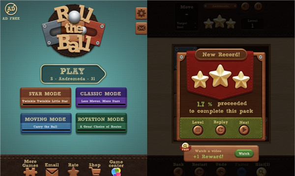 《Roll The Block》共有四种模式,最基本的是星星模式,这种情况下不用考虑移动木块通关所用的步数;第二种是经典模式,每个关卡通关的最高步数都会被记录,比较像三消游戏里的用最少的移动次数达到特定要求。另外两种分别是移动模式和旋转模式,但由于需要通关星星模式里的所有关卡。