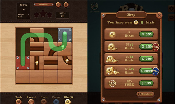 付费方式上,该游戏采取了广告+IAP模式,除了免广告(1.99美元)功能之外,玩家们还可以通过付费方式购买提示数量,提示的作用在于帮助玩家更快的找到通关路线,但如何组合排列仍需要动脑筋(如下图)。