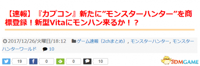 ·12月26日,卡普空公布了于2017年12月4日提出的怪物猎人新标申请注册,注册内容明确写着“携带用掌机设备用”,预示着新的掌机《怪物猎人》系列游戏或将要开启!