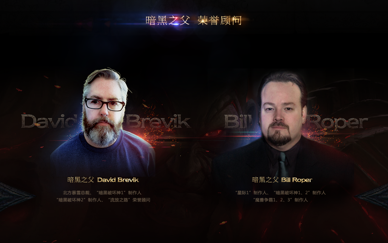 此次不限号测试邀请到了“David Brevik”(北方暴雪总裁、“暗黑破坏神1”制作人、“暗黑破坏神2”制作人)和“Bill Roper”(“星际争霸1”制作人、“暗黑破坏神1/2”制作人、“魔兽争霸1/2/3”制作人)担任《流放之路》的荣誉顾问,为大家带来更为纯粹的暗黑类极致爽快体验。