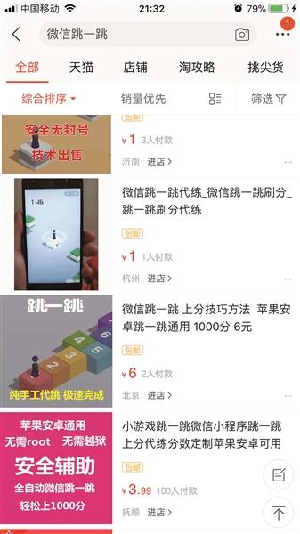 记者在网上购物平台检索“跳一跳”发现,有不少商家提供“跳一跳”代玩服务,价格从几元到几十元不等。有商家宣传称,出售的代玩程序,可以“模拟人工点击”,“轻松上1000分”,且“安全,不会被封号”。还有商家称,出售人工代玩服务,可以由买家定制想要的分数,付款后由商家帮助“代练”。不少商家提到,为了让买家信任,代跳全程可以进行视频直播。
