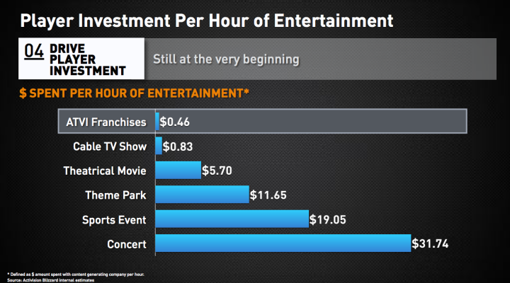 Activision在其2015年的报告中谈到,假设娱乐产品基于时间的价格体系被打破,电子游戏平均每小时的营收会变得很低。据他们估算,人们平均每小时花费在看电影上的金钱是5.7美元,但是对于游戏来讲,如果把买游戏的钱与投入在游戏上的时间分开,玩家每小时只需花费0.46美元左右。这种对两个不同的娱乐形式的直接比较不一定公平,但是这却推动了公司的内部(绩效)目标。