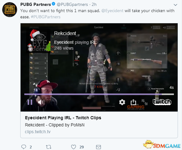 国外《绝地求生》媒体PUBG Partners在推特上秀出大神Eyecident多杀操作,40秒内击杀多人团灭一个队,震惊小伙伴。有这种技术的队友何患不能吃鸡?操作视频片段截取自Eyecident直播画面。下面一起看看推特内容。