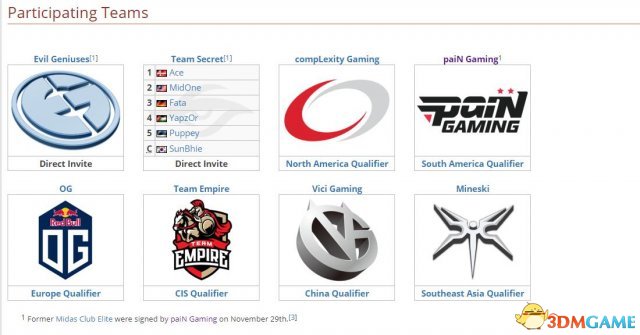 本次比赛共有8支战队参加,其中EG和秘密是直接受邀,其他六支队伍则是通过预选赛产生,分别是COL,PainGaming(替代Midas Club Elite),OG,帝国,中国战队VG和东南亚队伍Mineski。