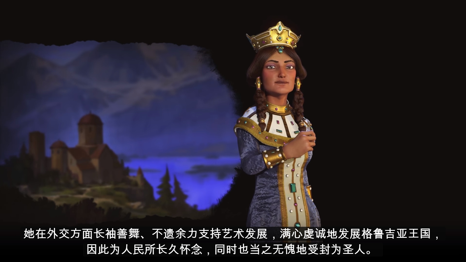 格鲁吉亚的领袖是这个国家的第一位女王塔玛丽女王。塔玛丽女王拥有出色的政治及外交才能,并且支持人民的艺术创作。她的特色能力“世界、王国和信仰的荣光”可在格鲁吉亚宣告卫国战争后获得信仰值加成。
