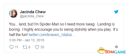 当然,问题来了:如果你不摆回去会怎么样?看来你会直接落地,然后摔成肉片。Chew称:落地,不过我是蜘蛛侠,我需要更多摆动。落地很糟。我强烈推荐你们在玩的时候摆地炫酷一点。