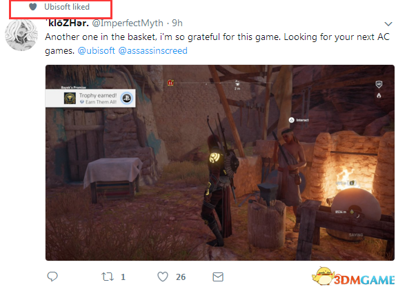 译文:又拿到一项成就,我非常感激这款游戏。期待你们的下一款《刺客信条》游戏。