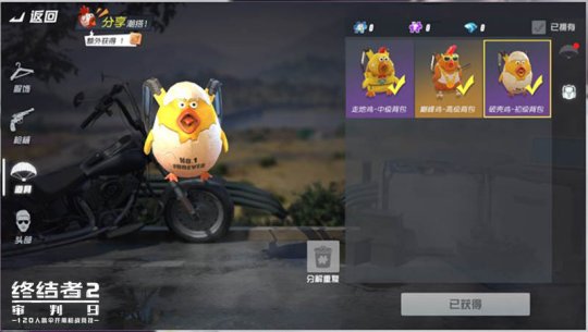 此次更新中有大量“吃鸡”主题道具外观上线,为玩家带来丰富多变的战场变装趣味。小鸡帽子、背包等造型萌点十足,在激烈的枪战竞技中为玩家带来乐趣,其中,暴鸡三兄弟的背包更是对应游戏里的初级,中级,高级背包,装备之后游戏内会替换成对应的暴鸡背包造型。
