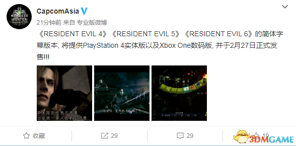 官方微博:《RESIDENT EVIL 4》《RESIDENT EVIL 5》《RESIDENT EVIL 6》的简体字幕版本, 将提供PlayStation 4实体版以及Xbox One数码版, 并于2月27日正式发售!!!