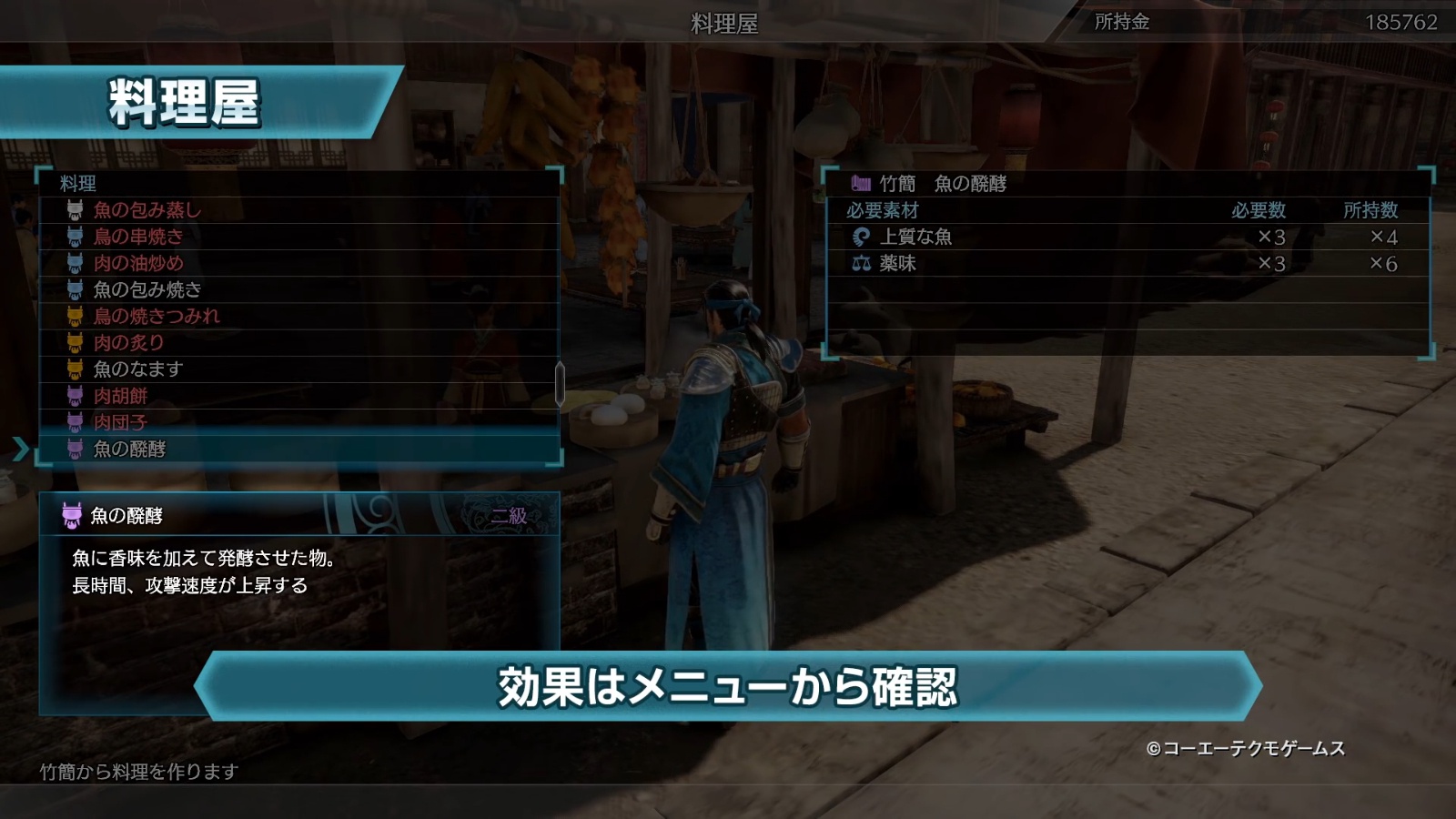本次视频展示了许昌的城市面貌,邓艾在城市中的料理屋进行购物,在制作对应的料理时,左侧可以确认料理发动的效果,右侧显示制作所需的材料。