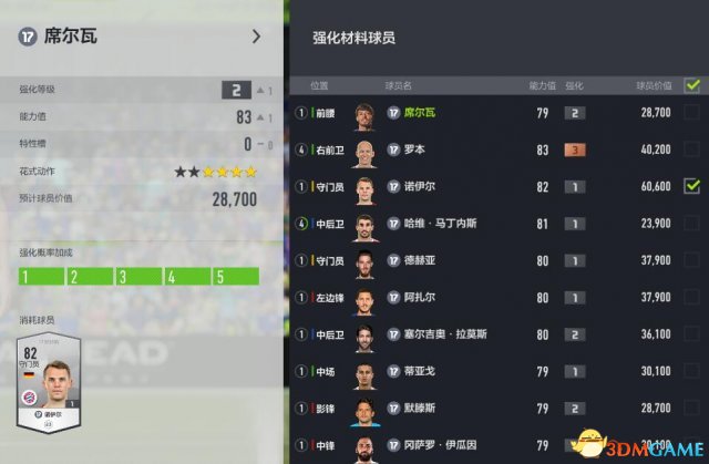 左侧为当前选择球员的基础信息,点击上方名字可改变强化球员,右侧为强化材料球员,每次强化可选择1-5名球员作为强化材料,强化材料与被强化球员无需为同一名球员,若强化材料与被强化球员为一致时,有概率触发特殊强化并且在强化失败时有概率恢复球员强化等级。选择的材料越多强化概率加成越高。