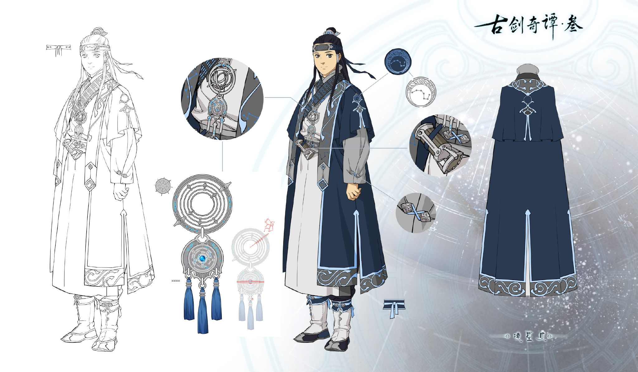 凌星见的外观设定上有明显的道教元素,蓝白的颜色也是吻合星空的静谧。胸前佩戴的挂件以浑天仪为原型,加入了星宿和星盘等元素。因为天文历算对于时间的要求很高,当初和美术讨论时就决定在他的身上做一个计时用的物件,虽然主要还是装饰用。他腰间的那个水壶样的东西就是参考了古代的漏壶而设计。