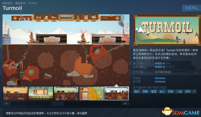 正像在1899年一样钻探石油!Turmoil 向玩家提供一种视觉上具有吸引力,玩笑式的模拟游戏,其灵感来自19世纪北美地区的石油开采热潮。