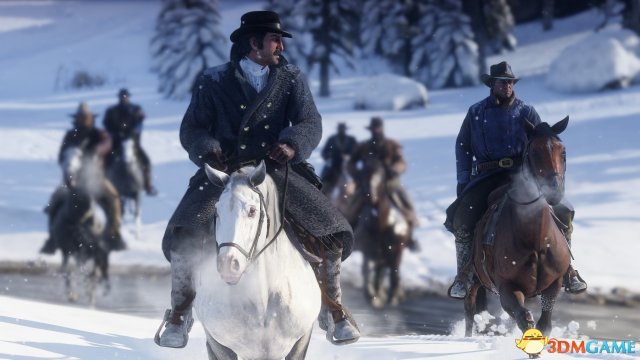 其他截图则展示了Morgan和他的帮派骑马穿过雪原的场景,暗示游戏将发生在多个不同的季节。