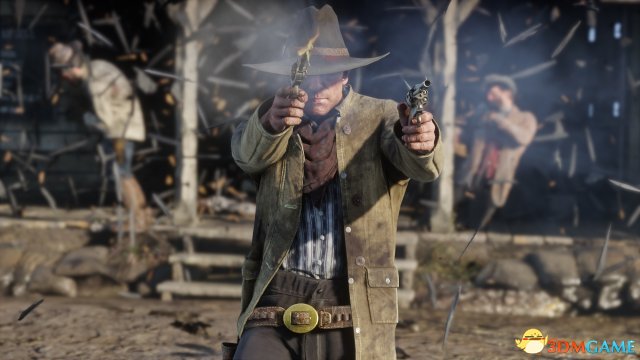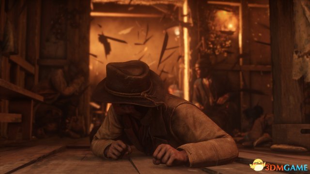 下面这张主角Morgan正趴在地板上,背后则是飞溅的木屑,身后还有两个人位于门旁,似乎是一个抢劫场景,需要大的爆破。