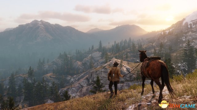 下面这张可以看到主角Morgan正在小憩,牵着马一览雄伟的山麓。