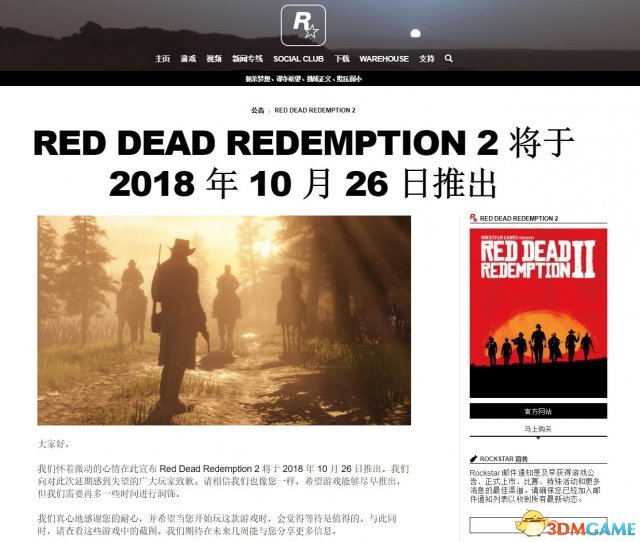 《荒野大镖客2》将于2018年10月26日发售,登陆PS4和Xbox One,或支持简体中文。