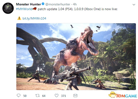 《怪物猎人:世界》官方推特日前发布了PS4版1.04补丁以及Xbox One版1.0.0.9补丁,主要修复了蛮颚龙任务等问题。