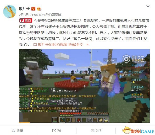 为了感谢各位员工的一路支持,厂长不仅在《MC厂长》中国季第十集中邀请炎黄蜀黍、小橙子姐姐同游养鸡二厂,砍树、挖矿,共建家园,还与各位冒险家结伴相约“成都养鸡二厂”服务器,共同庆祝《MC厂长》中国季的完结。