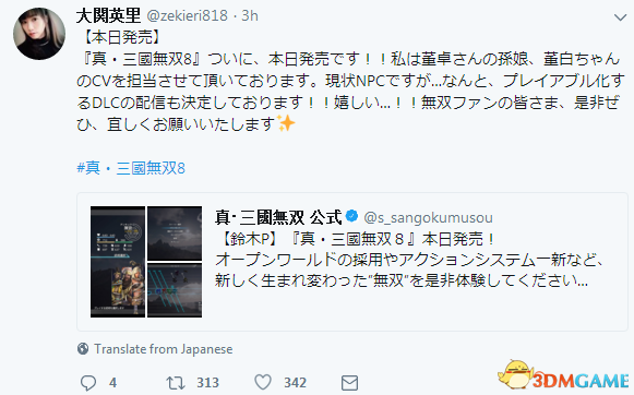 译文:《真三国无双8》今天终于发售了!我是董卓孙女董白的声优。虽然目前是NPC,不过玩家可以在DLC中操作这名萝莉角色!!我非常开心,真三粉丝请一定要玩,谢谢大家!