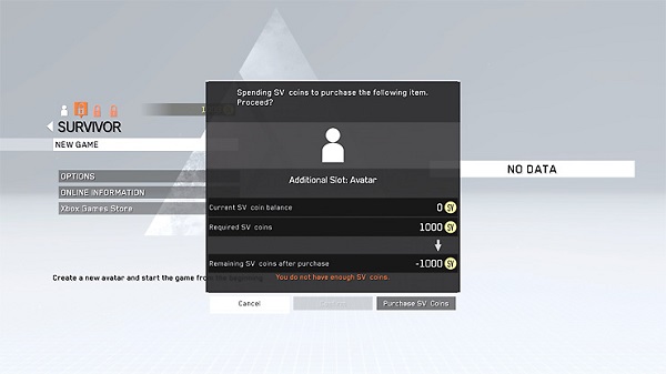 在《合金装备:幸存》中,玩家需要自己设计一名角色,而不是使用该系列知名的斯内克。这名自建角色将会用于游戏中的单人和多人模式中。如果还想继续建立新的角色,就需要使用1000个游戏中名为SV的货币,这种货币在游戏中可以使用现金购买,价格是550 SV币售价5美元。也就是说玩家想要开第二个游戏存档的话,大约需要10美元(约合人民币63元)。