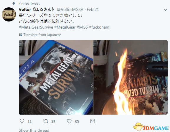 岛国玩家Voltor日前在推特上晒出了他烧毁《合金装备:幸存》PS4实体版的照片,以此来表达他对这款游戏的不满。他觉得合金装备系列作为一款长年作品,最新一作《合金装备:幸存》不可原谅。不得不说这名玩家也是有钱任性啊,其实烧的还是自己的钱。