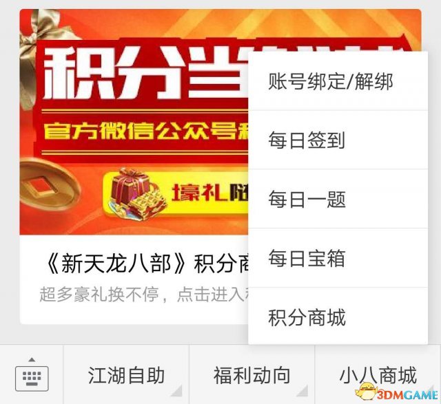 3.每日宝箱:每周微信推文中会出现宝箱钥匙(关键字),得到钥匙的玩家,可以点击“每日宝箱”,输入关键字符钥匙,即可获得2积分,如果是暴击,可能是一次是10积分哦!钥匙每周更新2次,第一次固定在周一的推文中放出,第二次将在周二到周五的推文中随机放出!
