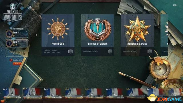 在即将更新的0.7.2中,为舰长们设置了法国黄金任务,任务共分三个阶段,每个阶段都有4个子任务组成,这些子任务会要求使用相应的战舰完成,特别是8级以上战列舰会更有利于完成任务。这三个阶段完成会有特殊的永久涂装奖励,完成第一阶段将获得敦刻尔克永久涂装,完成第二阶段任务将获得加斯科涅永久涂装奖励,完成第三阶段任务将获得黎塞留永久涂装: