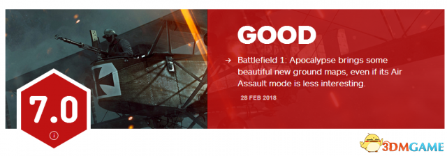 IGN日前发布了《战地1》DLC“启示录”的评分,最终这款DLC获得7分,还行。《战地1》启示录DLC应该被看作一个地图扩展包,2张特别好的陆战地图让游戏更好,但空袭模式做的有些差强人意,笨拙的操作和匮乏的内容略显尴尬。