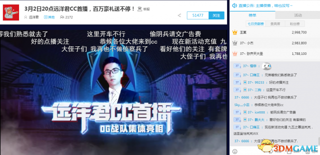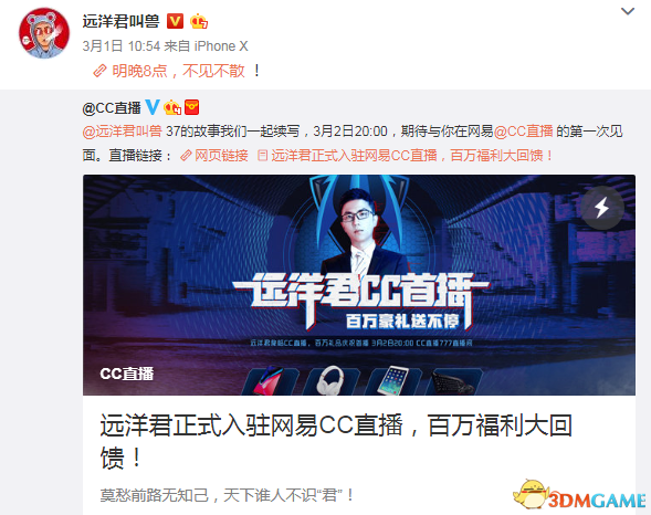 远洋君在微博上表示自己将在3月2日晚上8点,于CC直播平台进行首播,直播间也是相当好记的“777”,相信远洋君的粉丝们也不会迷路。在本次首播中,远洋君将秉承他的豪气大方,送出百万大礼,包括IPhoneX、Ipad等礼物,重情重义也是远洋君的特色。虽然他宣布转到CC直播平台才一天,新直播间已经迅速有超过五万的关注,不少粉丝已经刷了礼物。即使远洋君还没有开播,直播间已经热闹非凡,大家都因为远洋君聚在一起。