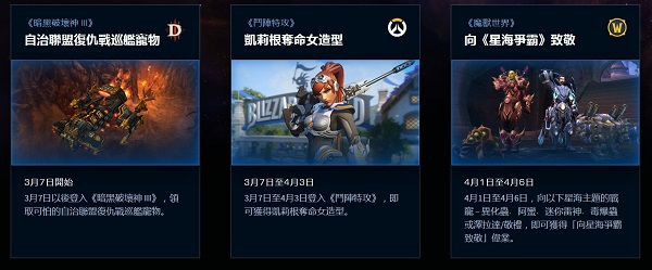 其中,3月7日至4月3日登录《守望先锋》,即可获得凯瑞甘黑百合造型。3月7日以后登录《暗黑破坏神3》,就能领取可怕的自治联盟复仇战巡舰宠物。