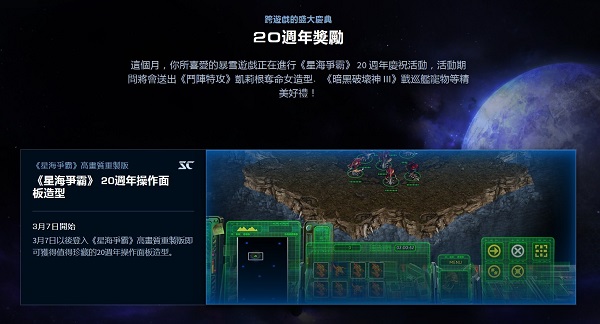 此外,3月7日以后登录《星际争霸》高画质重制版即可获得值得珍藏的20周年操作面板造型。