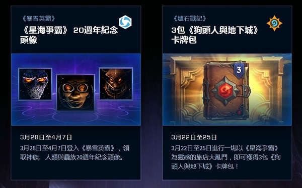 4月1日至4月6日《魔兽世界》中,向以下星海主题的战宠–异化虫﹑阿蛮﹑迷你雷神﹑毒爆虫或泽拉达/敬礼,即可获得“向星际争霸致敬”伟业。《炉石传说》3月22日至25日进行一场以《星际争霸》为灵感的旅店大乱斗,即可获得3包《狗头人与地下城》卡牌包。而3月28日至4月7日登录《风暴英雄》,能领取神族﹑人类与虫族20周年纪念头像。