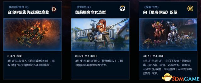 3月7日至4月3日登录《守望先锋》,即可获得凯瑞甘黑百合造型。3月7日以后登录《暗黑破坏神3》,就能领取可怕的自治联盟复仇战巡舰宠物。