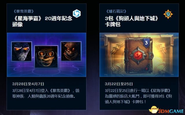 4月1日至4月6日《魔兽世界》中,向以下星海主题的战宠–异化虫﹑阿蛮﹑迷你雷神﹑毒爆虫或泽拉达/敬礼,即可获得“向星际争霸致敬”伟业。《炉石传说》3月22日至25日进行一场以《星际争霸》为灵感的旅店大乱斗,即可获得3包《狗头人与地下城》卡牌包。而3月28日至4月7日登录《风暴英雄》,能领取神族﹑人类与虫族20周年纪念头像。