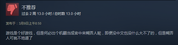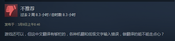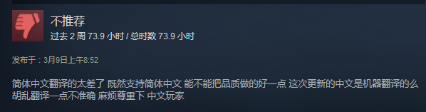 正式版上线后,官方承诺的中文也推出了。但根据玩家反馈来看,此次游戏的中文翻译质量并不好,很多玩家在游戏评测区表示,游戏的中文翻译有明显机翻迹象。