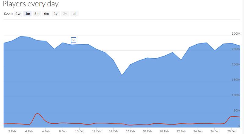 从每日最高同时在线玩家数的数据可以看到——每日最高同时在线玩家数在2月15日出现短暂下跌,但随后快速反弹。而《绝地求生》中国用户占比超过50%,在中国春节期间,玩家不仅忙于走亲访友及春运迁徙,同时也受到网络与设备的限制。可以看到,春节过后,每日最高同时在线玩家数立即恢复到节前水平。