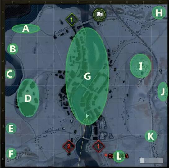 右路情况比起以前也变得非常简单,硕大的山丘几乎被完全移除,仅留下了I点,I点的建筑物以及草丛使得这个点非常的重要,是上方出生玩家必拿之地,而J点也比较适合眼车侦查,H、K、L等点也比较适合当做支撑点,以及防御性眼位。