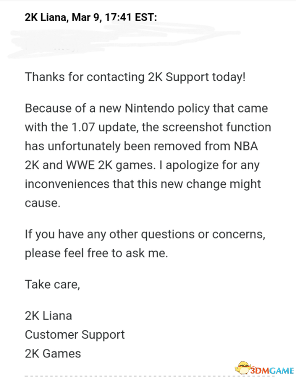 最近2K对Switch《NBA 2K18》进行了升级,更新升级之后版本号为1.07,有玩家发现升级后游戏已经不能使用Switch系统自带的截图功能。随后有玩家向2K官方提出问题,在官方回复的邮件中,我们发现因为受到“任天堂新政策”的影响,所以2K去掉了截图功能。受到影响的并不只有《NBA 2K18》,同样来自2K的《WWE 2K18》也在升级后去除了截图功能。