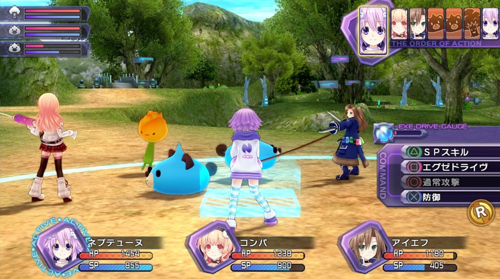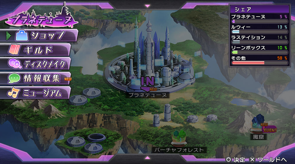 本作的背景设定在被称为“游戏业界”的奇妙世界里,这个世界共分为プラネテューヌ、ラステイション、ルウィー、リーンボックス四个国家,每个国家都存在可以接受任务的行会。同时居住在当地的人们可以为玩家提供各种各样的信息,一定要多多利用。
