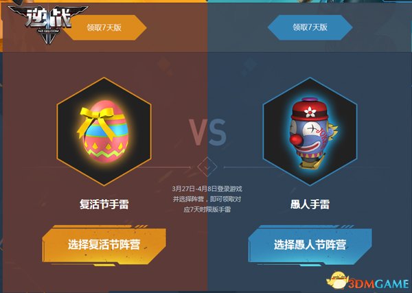 2018年的复活节刚好撞上了愚人节,都是4月1日,在这一天你会选择过复活节还是愚人节呢?在《逆战》中,玩家同样将面临这样的抉择——是选择复活节阵营领取复活节手雷,还是支持愚人节阵营获得愚人手雷。3月27日至4月8日活动期间,玩家登录游戏并选择阵营,就能够领取到所属阵营对应的7天时限版手雷。