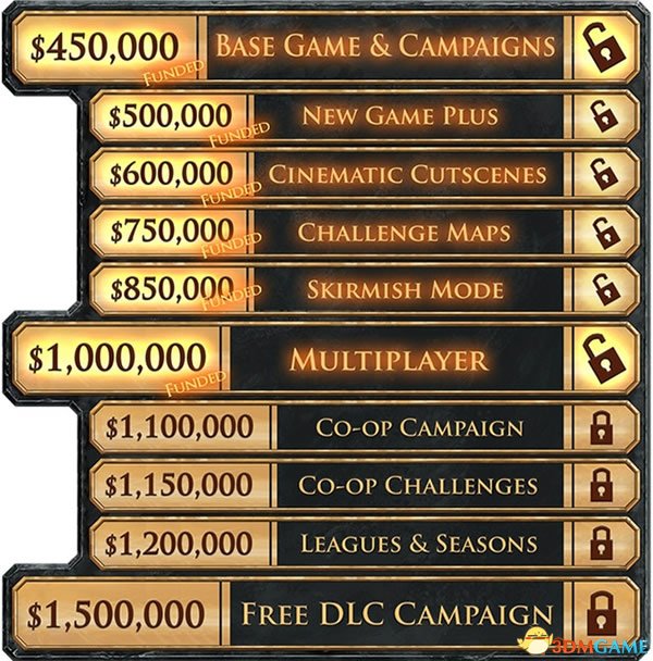 游戏众筹已经突破100万美元,官方承诺为游戏加入多人模式,110万美元为合作模式,115万美元为合作挑战,120万美元为赛季模式,150万美元则会加入免费DLC战役。