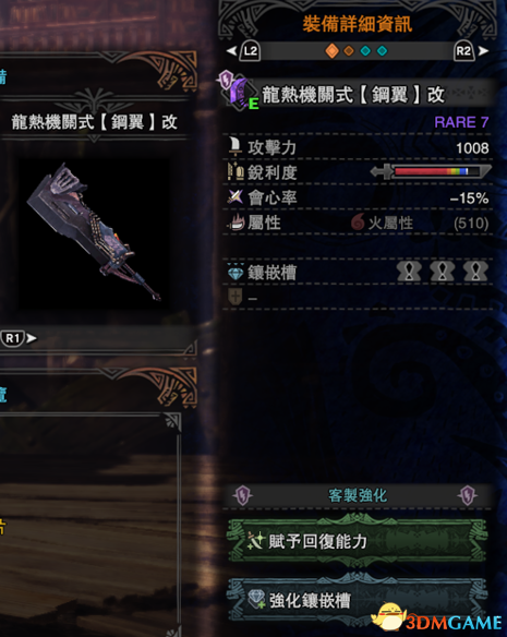 ·获得玩家武器设计大奖赛最优秀奖作品,此巨剑名曰:《龙热机关式 钢翼》,具有超酷外观和联动机关设定,并且综合性能属于超档级别。