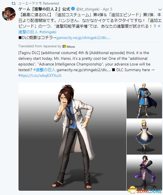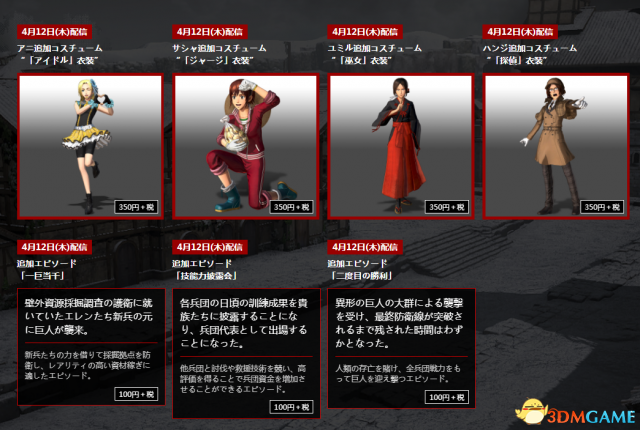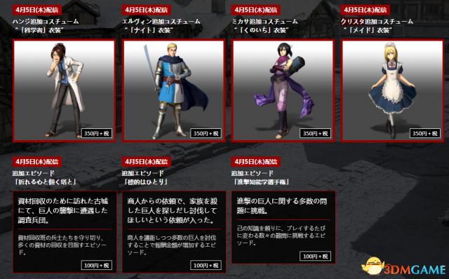《进击的巨人2》官方日前公布了游戏第四弹服装DLC,以及追加故事第三弹内容,这些DLC已在4月5日上线,服装包含:科学家,骑士,女仆和忍者,其中女仆和忍者服装非常可爱。同时官网也发布了第五弹服装DLC,分别为偶像套装,运动服,女巫服和侦探服装。