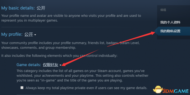 具体扩展的隐私状况设置是在玩家的个人资料—编辑个人资料—我的隐私设置中,玩家将可以选择哪些人可以看到你的游戏细节(Game details)信息,其中包含你已经购买的游戏、愿望单中的游戏、游戏成就、游戏时长。同时这项设置也将影响到玩家是否被看到“在游戏中”以及具体玩的游戏。