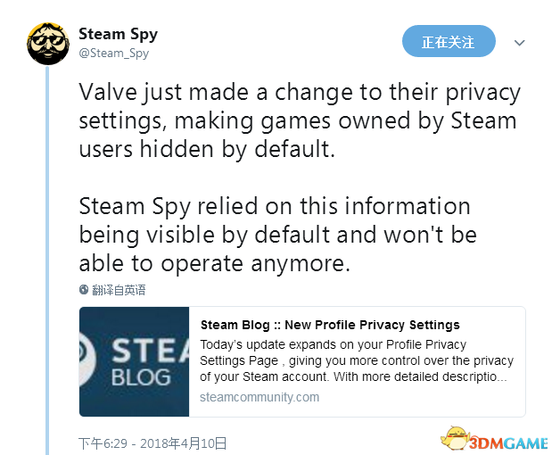 而上面关于玩家游戏细节(Game details)信息的隐私调整,将严重影响到Steam第三方数据统计网站SteamSpy的数据收集。
