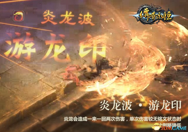 炎龙波·灼龙印:地面残留火焰灼烧效果,对站在其中的目标每秒造成伤害。