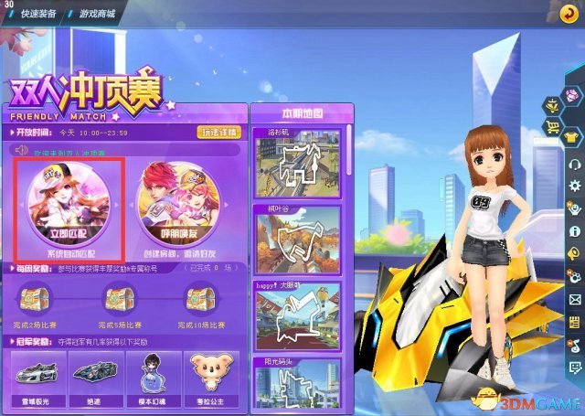 双人冲顶赛是QQ飞车在4月新版本中推出的限时双人组队竞速玩法。比赛分为好友组队和随机匹配两种模式,点击立即匹配可以进入单人匹配队列,系统会为你匹配一起参与游戏的异性玩家,在单人匹配中也支持男男匹配;点击邀请好可以邀请其他玩家一起参赛,争夺八支队伍的冠军,获得胜利的玩家有机会获得永久A车和极品宠物的奖励。